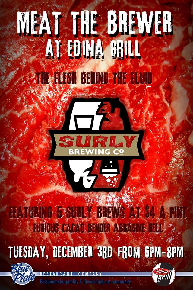 Head to Edina Grill for the Meat the Brewer Surly event on Tuesday, Dec. 3 from 6-8pm. Meet head brewer Todd Haug and get Furious, Cacao Bender, Bender, Abrasive and Hell for $4/pint.