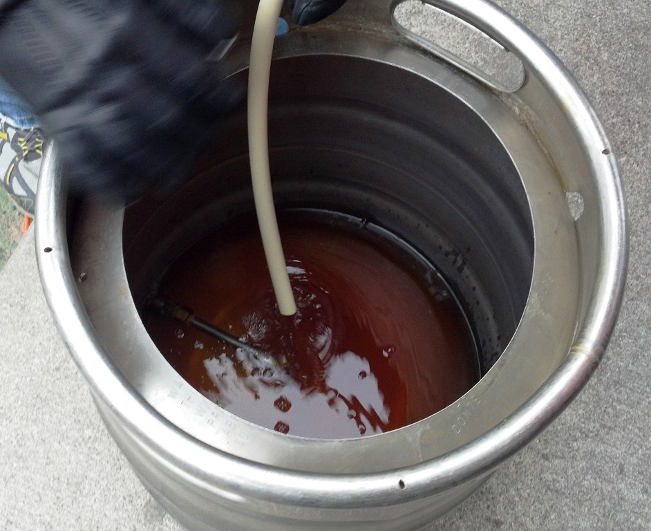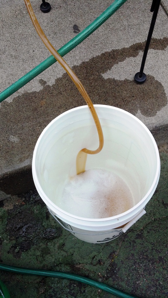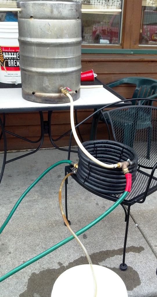 Your boil is complete. Now, the ever-important wort chilling process. Most of you are likely aware of this. Whether it’s ice, immersion, plate or counterflow (shown), this is important to reach a safe temp for your yeast. Ideally you want to be below 80 degrees. I prefer to be in the low 70s to the upper 60s. Run off the wort into your sanitized (very important) fermenter.