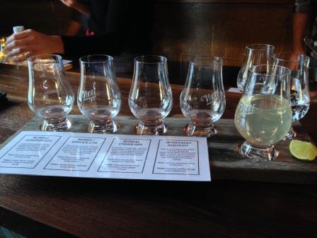 As I worked through the flight, I overheard a customer ask if they could buy some of the two-dozen Vikre Distilling gin bottles prominently displayed on iilluminated wooden shelves built into the wall behind the bar.